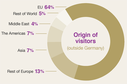 來自德國以外的參展商和觀眾的比例分別為48%34%,海外參展商的比例繼續有所增加,但海外觀眾的比例有輕微下跌。繼德國之后參展商最多的國家分別是:意大利、土耳其、中國、荷蘭、瑞士、西班牙、奧地利、法國和美國。繼德國之后觀眾最多的國家分別是:奧地利、荷蘭、瑞典、瑞士、英國、意大利、丹麥、比利時、印度、捷克共和國和波蘭。