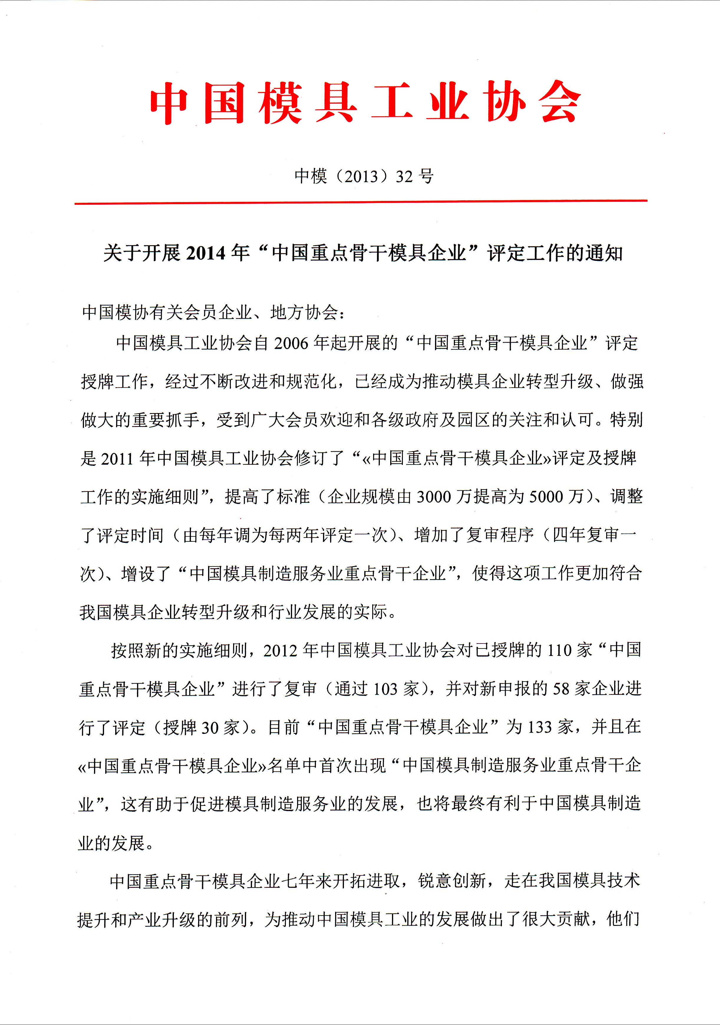 關(guān)于開展2014年“中國重點骨干模具企業(yè)”評定工作的通知