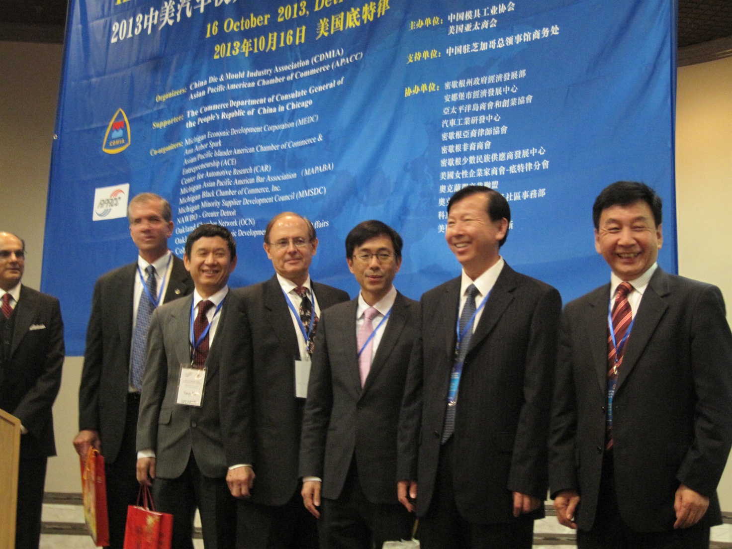 2013年10月16日早8點,主辦方精心設計和安排的“中美經濟貿易采購展示洽談會”準時舉行,會議現場布置的生動活潑,井井有條,超大屏幕的中方企業的視頻展播更為展示會增添了一道靚麗的風景,吸引著眾多美方采購商和代表的關注。圍繞會議現場一周設置的一汽模具等十八家中方企業的展示臺和展示板布置的色彩鮮艷、企業形象突出、技術特點充分體現,會場中心為各展示企業的洽談圓桌,而為起早驅車趕來的美方代表準備的早餐與圓桌洽談相配合,使雙方的采購洽談和交流在輕松、友好、愉快地氣氛中進行, 更顯現出北美的風情。美國密歇根州Robert A.Ficano郡長一大早就趕到展示洽談會現場,與中國模協領導和展示企業一一相見交流和洽談,同時對來參加洽談的美方代表表示感謝和關心,體現了密歇根州政府對這次會議的重要關注,表現了對這次活動的極大的重視和滿意。參會的美方代表有福特汽車模具、克萊斯勒、通用汽車、加拿大麥格納等眾多北美汽車及汽車零部件及相關企業的技術主管、采購主管等,會議現場人頭涌動、氣氛熱烈,情緒高昂,各自在尋找各自的需求,采購的、交流的、洽談的忙忙碌碌,會議現場中方企業展示臺邊,企業家彬彬有禮接待來洽談的貴賓,氣氛融洽,新的朋友、關注你的客戶、想為進入北美的企業服務的相關公司讓中方展示企業應接不暇,中美雙方的代表都為這次活動的成功舉辦感到非常滿意,相信中美雙方均能收到預期的效果,為中美企業的合作搭建了一個創新的平臺。