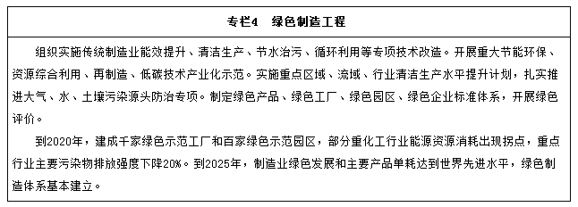 加大先進節能環保技術、工藝和裝備的研發力度,加快制造業綠色改造升級;積極推行低碳化、循環化和集約化,提高制造業資源利用效率;強化產品全生命周期綠色管理,努力構建高效、清潔、低碳、循環的綠色制造體系。