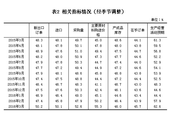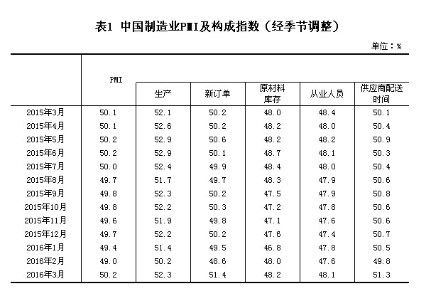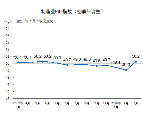 |  中國經濟網北京4月1日訊 今天,國家統計局發布3月份制造業數據,數據顯示,3月中國制造業采購經理指數(PMI)為50.2%,比上月上升1.2個百分點,重回擴張區間。    分企業規模看,大型企業PMI為51.5%,比上月上升1.6個百分點,升至臨界點以上;中型企業PMI為49.1%,比上月回升0.1個百分點,繼續位于臨界點以下;小型企業PMI為48.1%,比上月回升3.7個百分點,仍位于收縮區間。   從分類指數看,在構成制造業PMI的5個分類指數中,生產指數、新訂單指數、供應商配送時間指數高于臨界點,從業人員指數和原材料庫存指數低于臨界點。   生產指數為52.3%,比上月上升2.1個百分點,繼續位于臨界點以上,表明制造業生產增速加快。   新訂單指數為51.4%,比上月上升2.8個百分點,重返擴張區間,表明制造業市場需求回升。   從業人員指數為48.1%,比上月回升0.5個百分點,繼續低于臨界點,表明制造業企業用工量降幅收窄。   原材料庫存指數為48.2%,比上月回升0.2個百分點,仍位于臨界點以下,表明制造業主要原材料庫存量降幅小幅收窄。   供應商配送時間指數為51.3%,高于臨界點,表明制造業原材料供應商交貨時間有所加快。            附注   1.主要指標解釋   采購經理指數(PMI),是通過對企業采購經理的月度調查結果統計匯總、編制而成的指數,它涵蓋了企業采購、生產、流通等各個環節,是國際上通用的監測宏觀經濟走勢的先行性指數之一,具有較強的預測、預警作用。PMI通常以50%作為經濟強弱的分界點,PMI高于50%時,反映制造業經濟擴張;低于50%,則反映制造業經濟收縮。   2.調查范圍   涉及《國民經濟行業分類》(GB/T4754-2011)中制造業的31個行業大類,3000家調查樣本。   3.調查方法   制造業采購經理調查采用PPS(Probability Proportional to Size)抽樣方法,以制造業行業大類為層,行業樣本量按其增加值占全部制造業增加值的比重分配,層內樣本使用與企業主營業務收入成比例的概率抽取。   本調查由國家統計局直屬調查隊具體組織實施,利用國家統計聯網直報系統對企業采購經理進行月度問卷調查。   4.計算方法   制造業采購經理調查問卷涉及生產量、新訂單、出口訂貨、現有訂貨、產成品庫存、采購量、進口、購進價格、原材料庫存、從業人員、供應商配送時間、生產經營活動預期等12個問題。對每個問題分別計算擴散指數,即正向回答的企業個數百分比加上回答不變的百分比的一半。   PMI是一個綜合指數,由5個擴散指數(分類指數)加權計算而成。5個分類指數及其權數是依據其對經濟的先行影響程度確定的。具體包括:新訂單指數,權數為30%;生產指數,權數為25%;從業人員指數,權數為20%;供應商配送時間指數,權數為15%;原材料庫存指數,權數為10%。其中,供應商配送時間指數為逆指數,在合成PMI綜合指數時進行反向運算。   5.季節調整   采購經理調查是一項月度調查,受季節因素影響,數據波動較大。現發布的PMI綜合指數和各分類指數均為季節調整后的數據。 |