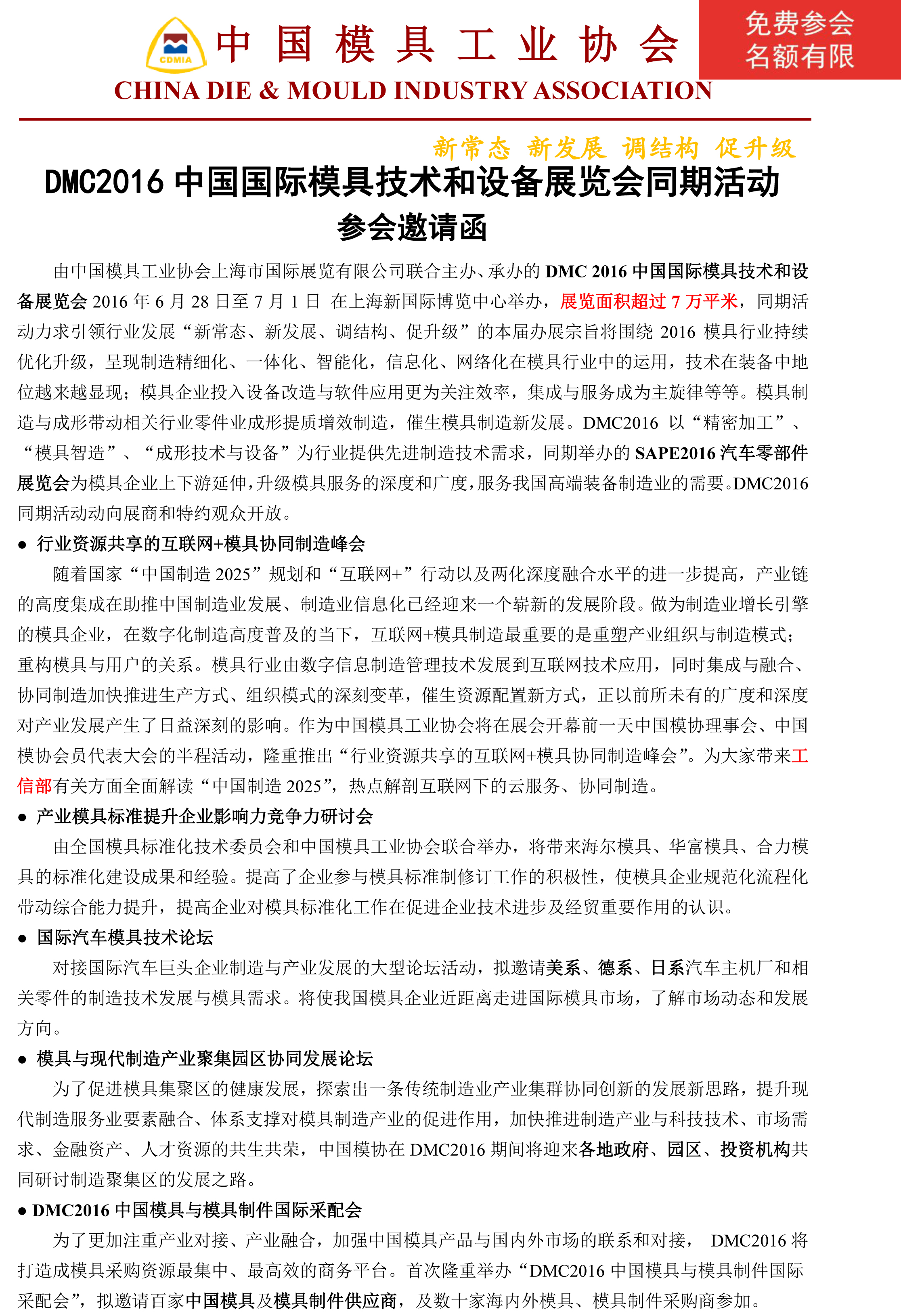 DMC2016中國國際模具技術和設備展覽會同期活動 參會邀請函