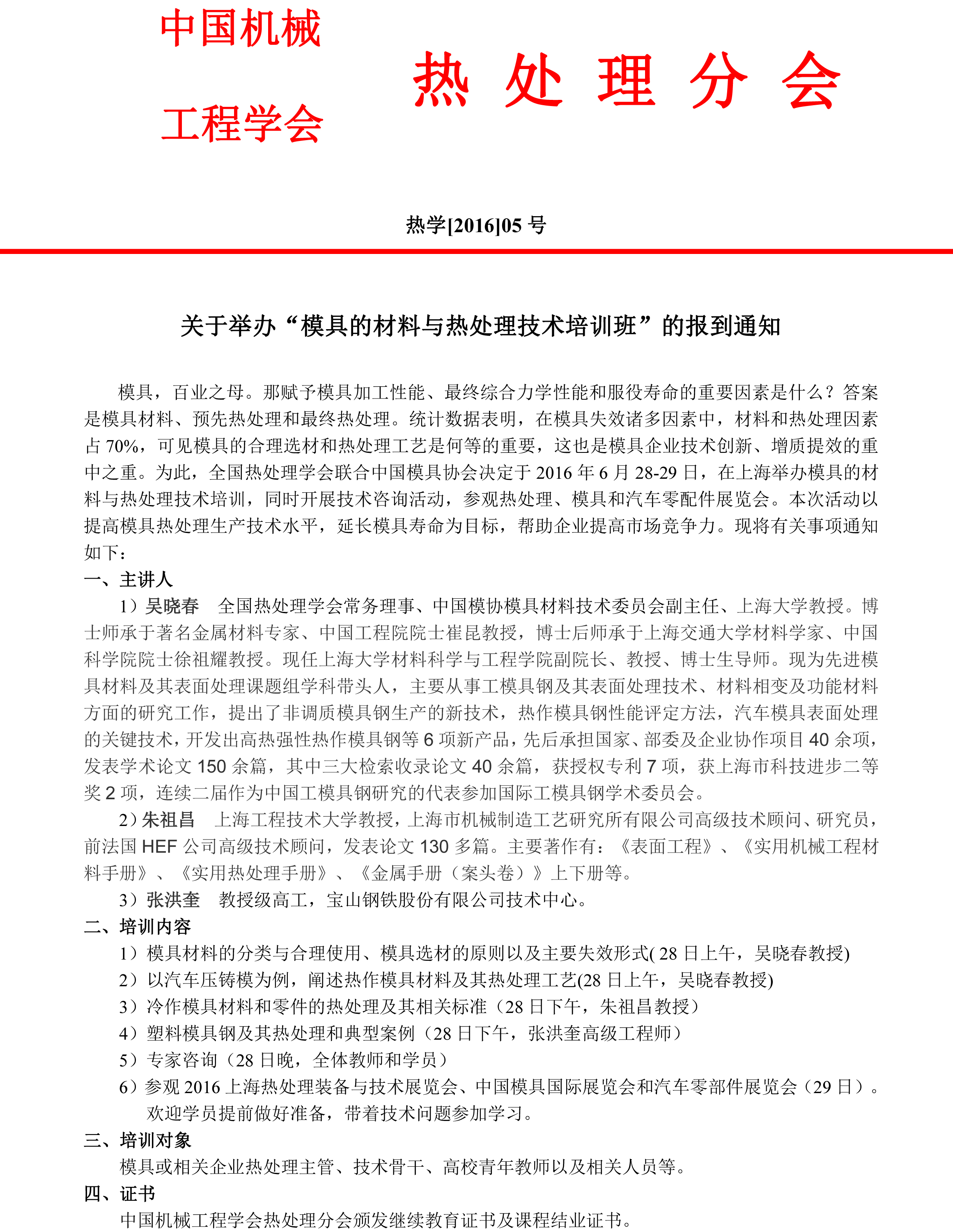 關于舉辦“模具材料與熱處理技術培訓”的通知