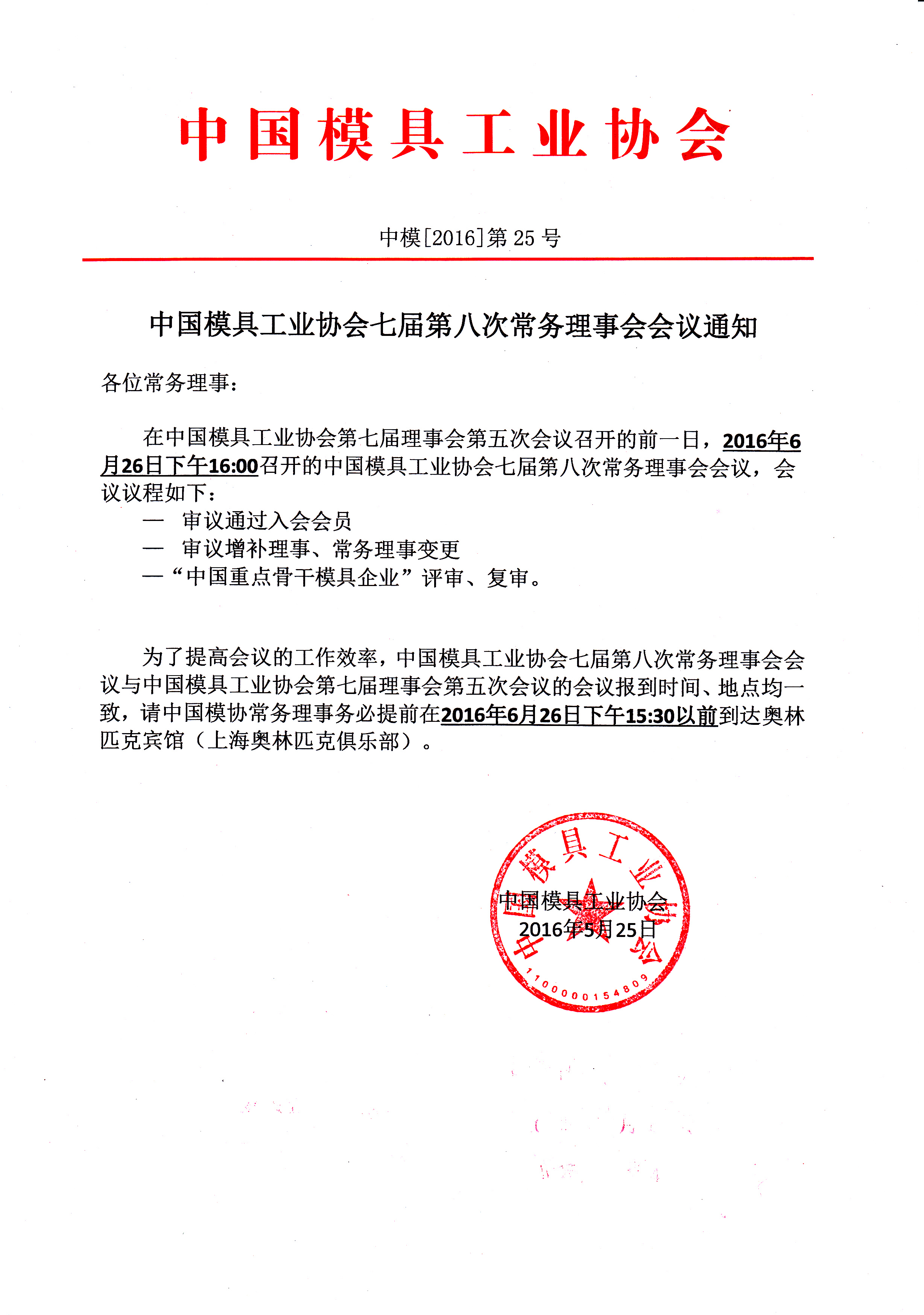 中國模具工業協會七屆第八次常務理事會會議通知