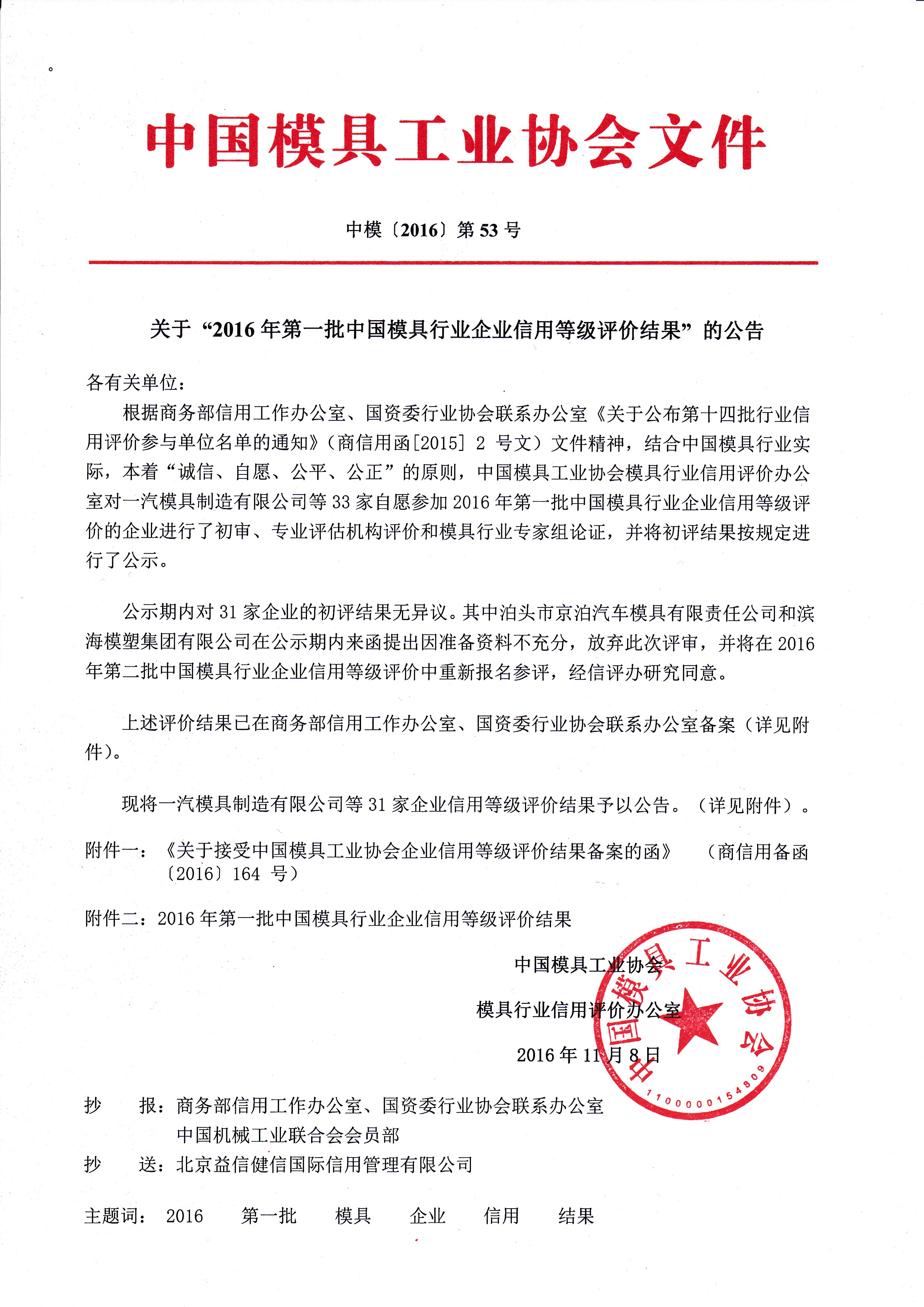 關(guān)于“2016年第一批中國模具行業(yè)企業(yè)信用等級評價結(jié)果”的公告