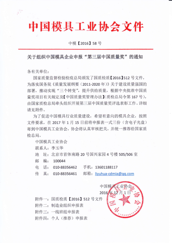 關于組織中國模具企業申報“第三屆中國質量獎”的通知