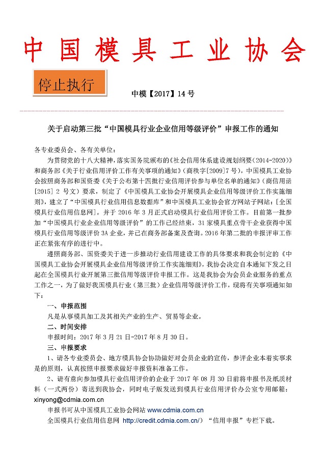 關(guān)于啟動(dòng)第三批“中國模具行業(yè)企業(yè)信用等級(jí)評(píng)價(jià)”申報(bào)工作的通知