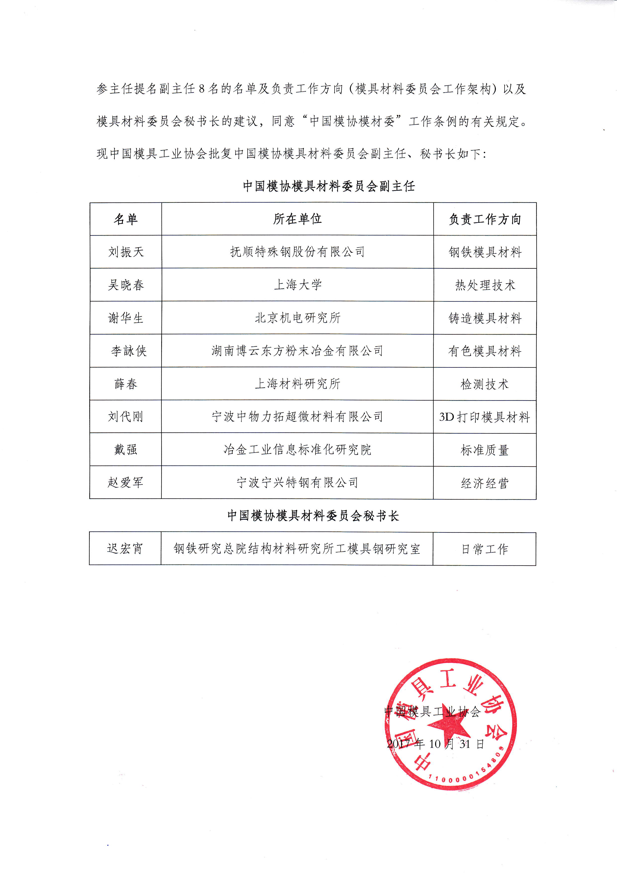 模具材料委員會關于新一屆副主任、秘書長組成及工作架構的批復