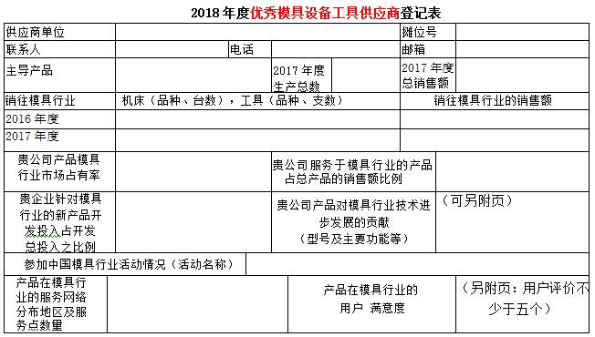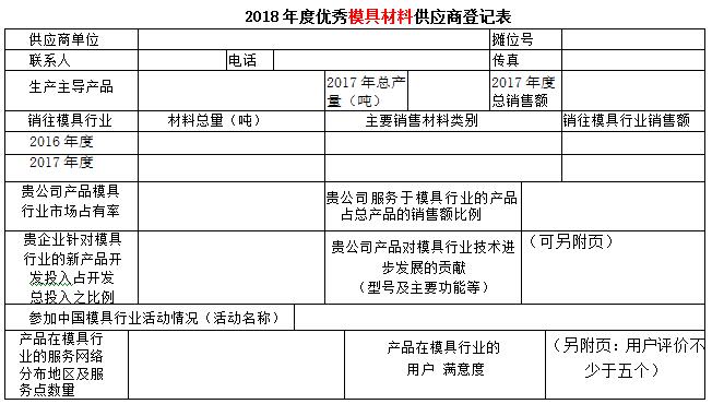 現(xiàn)代模具工業(yè)是高技術(shù)背景下的資金和技術(shù)密集型工業(yè)。隨著模具行業(yè)的發(fā)展,現(xiàn)代模具要實(shí)現(xiàn)數(shù)字化設(shè)計(jì)、數(shù)字化制造、數(shù)字化管理、數(shù)字化生產(chǎn)流程來(lái)實(shí)現(xiàn)模具工業(yè)的現(xiàn)代化。模具材料是降本提質(zhì)增效的重要至關(guān)領(lǐng)域,為了服務(wù)模具企業(yè)提高模具材料使用,提升使用的能力, 第十八屆中國(guó)國(guó)際模具技術(shù)和設(shè)備展覽會(huì)主辦單位之一的中國(guó)模具工業(yè)協(xié)會(huì)十分注重展覽會(huì)的內(nèi)涵,在歷屆展覽會(huì)上均開(kāi)展了對(duì)展覽會(huì)展品的評(píng)述工作,至今已成定式。為了更好地為模具企業(yè)提供多元的服務(wù),為企業(yè)的模具制造加工解決方案提供保障,進(jìn)一步推動(dòng)模具及模具相關(guān)行業(yè)交流與互動(dòng),在第十八屆中國(guó)國(guó)際模具技術(shù)和設(shè)備展覽會(huì)期間,中國(guó)模具工業(yè)協(xié)會(huì)委托中國(guó)模具工業(yè)協(xié)會(huì)模具材料委員會(huì),本著自愿的原則,依據(jù)供應(yīng)商裝備水平,在模具行業(yè)服務(wù)水平、市場(chǎng)占有率的高低、對(duì)模具行業(yè)服務(wù)滿(mǎn)意等行業(yè)貢獻(xiàn)指標(biāo),并結(jié)合模具企業(yè)的意見(jiàn)開(kāi)展評(píng)定優(yōu)秀模具材料供應(yīng)商活動(dòng),活動(dòng)不收取參評(píng)單位任何費(fèi)用。現(xiàn)將優(yōu)秀模具材料供應(yīng)商登記表發(fā)給你們,請(qǐng)予認(rèn)真填寫(xiě),盡快返回中國(guó)模具工業(yè)協(xié)會(huì)模具材料委員會(huì) 遲宏宵 收。
