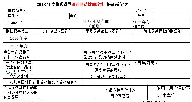 現(xiàn)代模具工業(yè)是高技術(shù)背景下的資金和技術(shù)密集型工業(yè)。隨著模具行業(yè)的發(fā)展,現(xiàn)代模具要實(shí)現(xiàn)數(shù)字化設(shè)計(jì)、數(shù)字化制造、數(shù)字化管理、數(shù)字化生產(chǎn)流程來(lái)實(shí)現(xiàn)模具工業(yè)的現(xiàn)代化。模具軟件是降本提質(zhì)增效的重要至關(guān)領(lǐng)域,為了服務(wù)模具企業(yè)提高模具軟件工具使用效率,提升使用能力,第十八屆中國(guó)國(guó)際模具技術(shù)和設(shè)備展覽會(huì)主辦單位之一的中國(guó)模具工業(yè)協(xié)會(huì)十分注重展覽會(huì)的內(nèi)涵,在歷屆展覽會(huì)上均開(kāi)展了對(duì)展覽會(huì)展品的評(píng)述工作,至今已成定式。為了更好地為模具企業(yè)提供多元的服務(wù),為企業(yè)的模具制造加工、集成、協(xié)同解決方案提供保障,進(jìn)一步推動(dòng)模具及模具相關(guān)行業(yè)交流與互動(dòng),在第十八屆中國(guó)國(guó)際模具技術(shù)和設(shè)備展覽會(huì)期間,中國(guó)模具工業(yè)協(xié)會(huì)委托中國(guó)模具工業(yè)協(xié)會(huì)數(shù)字化信息化委員會(huì)(數(shù)信委),本著自愿的原則,依據(jù)供應(yīng)商軟件水平,在模具行業(yè)服務(wù)能能力、市場(chǎng)占有率的高低、對(duì)模具行業(yè)服務(wù)滿(mǎn)意等行業(yè)貢獻(xiàn)指標(biāo),并結(jié)合模具企業(yè)的意見(jiàn)開(kāi)展評(píng)定優(yōu)秀模具設(shè)計(jì)制造管理軟件供應(yīng)商活動(dòng),活動(dòng)不收取參評(píng)單位任何費(fèi)用。現(xiàn)將優(yōu)秀模具設(shè)計(jì)制造管理軟件供應(yīng)商登記表發(fā)給你們,請(qǐng)予認(rèn)真填寫(xiě), 盡快返回中國(guó)模具工業(yè)協(xié)會(huì)數(shù)字化信息化委員會(huì) 魏青收。