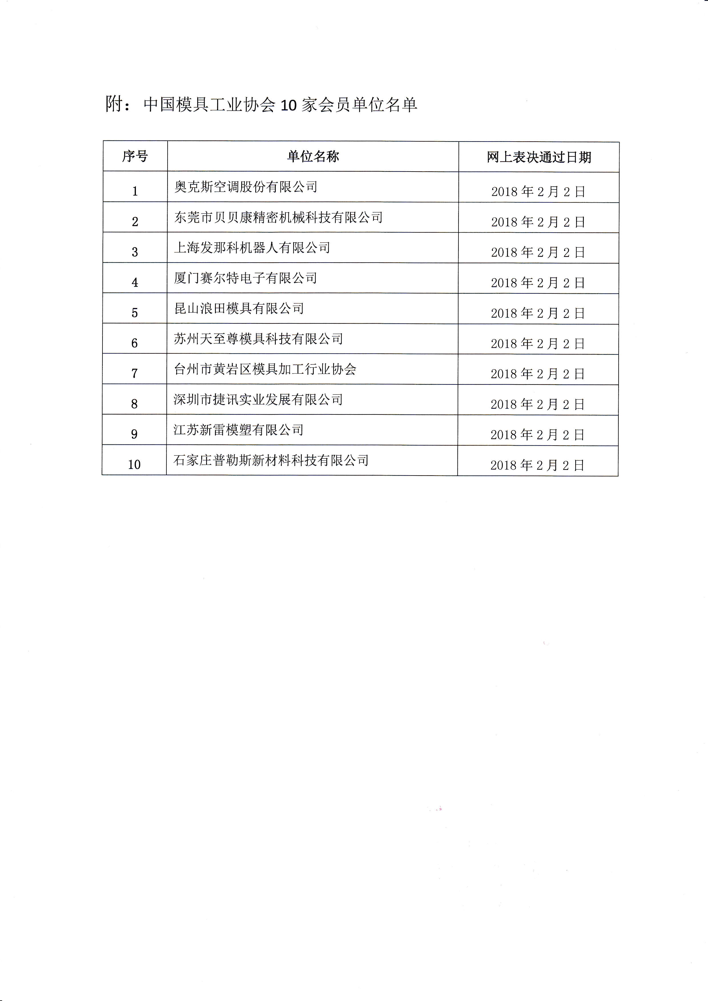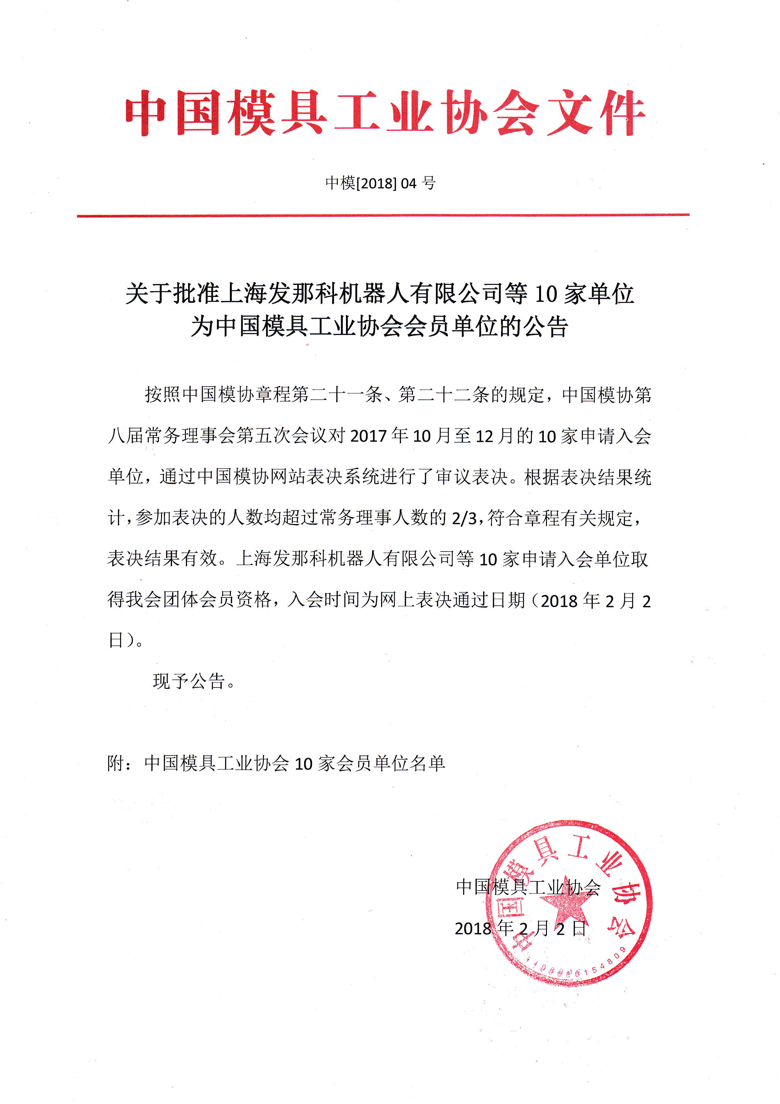 關于批準上海發那科機器人有限公司等10家單位為中國模具工業協會會員單位的公告