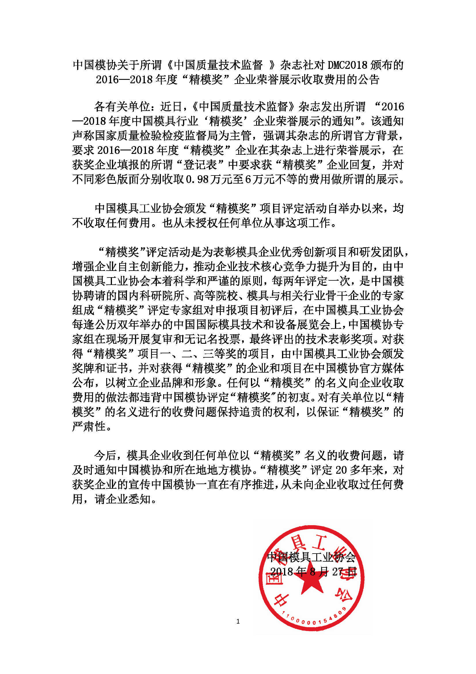 中國模協(xié)關(guān)于所謂《中國質(zhì)量技術(shù)監(jiān)督 》雜志對(duì)DMC2018頒布的2016—2018年度“精模獎(jiǎng)”企業(yè)進(jìn)行所謂榮譽(yù)展示的公告