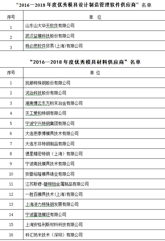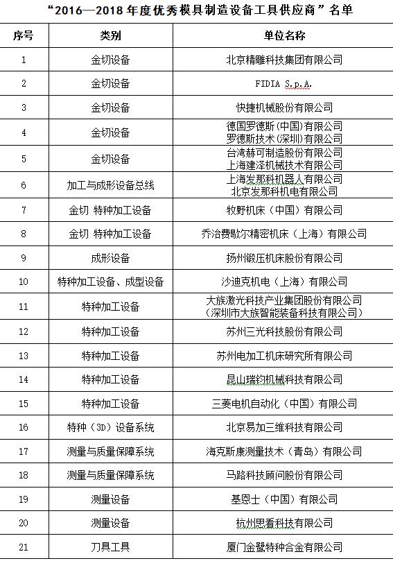 在知名品牌專業展會——中國國際模具技術和設備展覽會DMC上開展優秀供應商的評選活動,得到了各行業的廣泛認可,被評定為優秀供應商的企業,將在模具企業的采購中獲得優先推薦資格并在行業里得到廣泛的宣傳推廣,并在中國模協的官網上進行公告,至今已成定式。DMC2018期間,中國模具工業協會委托中國模協裝備委員會、數字化信息化委員會、材料委員會,本著自愿的原則,依據供應商的技術水平、在模具行業的服務能力、市場占有率的高低、模具行業服務滿意度等行業貢獻指標,并結合模具企業的意見,最終評選出21家“2016—2018年度優秀模具制造設備工具供應商”、3家“2016—2018年度優秀模具設計制造管理軟件供應商”、16家“2016—2018年度優秀模具材料供應商”(同時見m.www-liu118.com,diemouldchina.com.cn),具體名單如下所示,排名均不分先后。