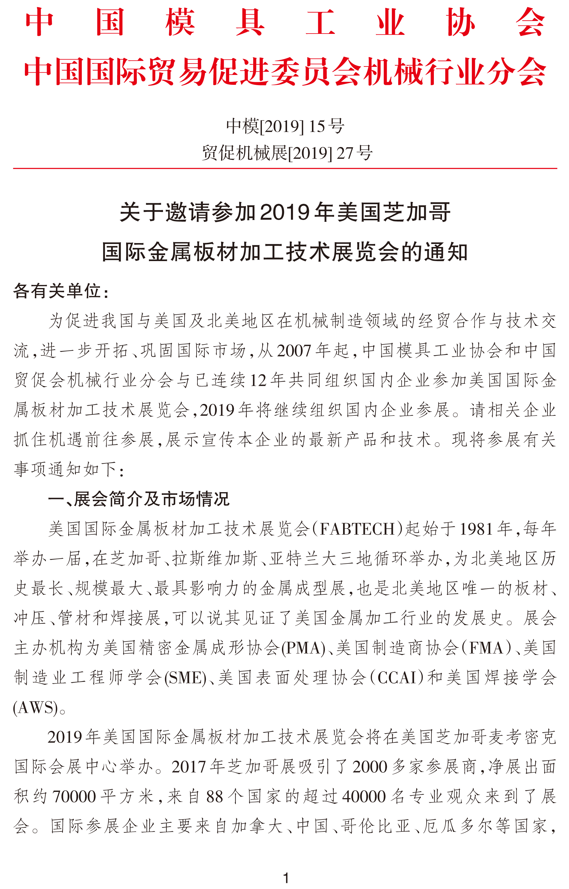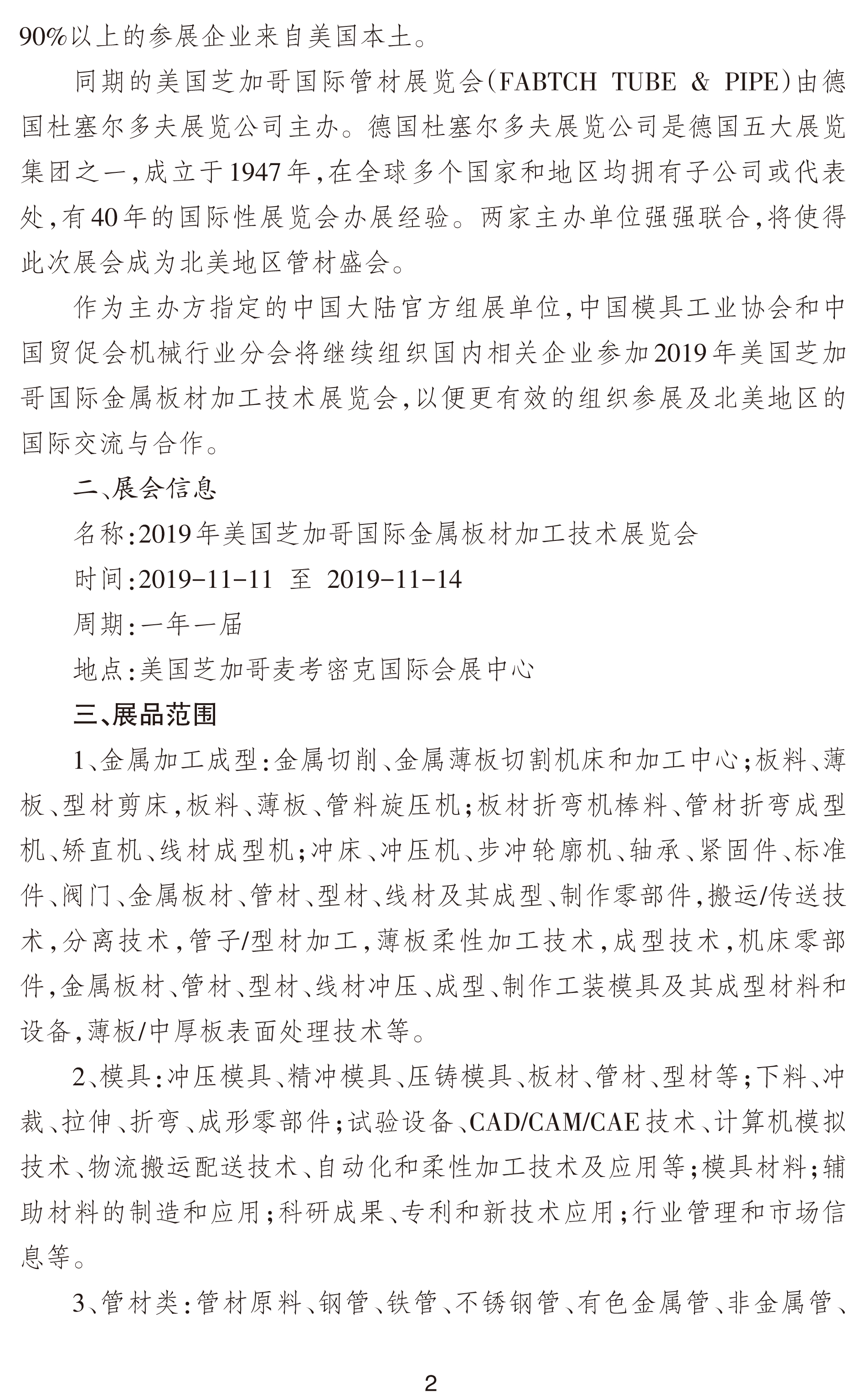 關(guān)于邀請(qǐng)參加2019年美國(guó)芝加哥國(guó)際金屬板材加工技術(shù)展覽會(huì)的通知