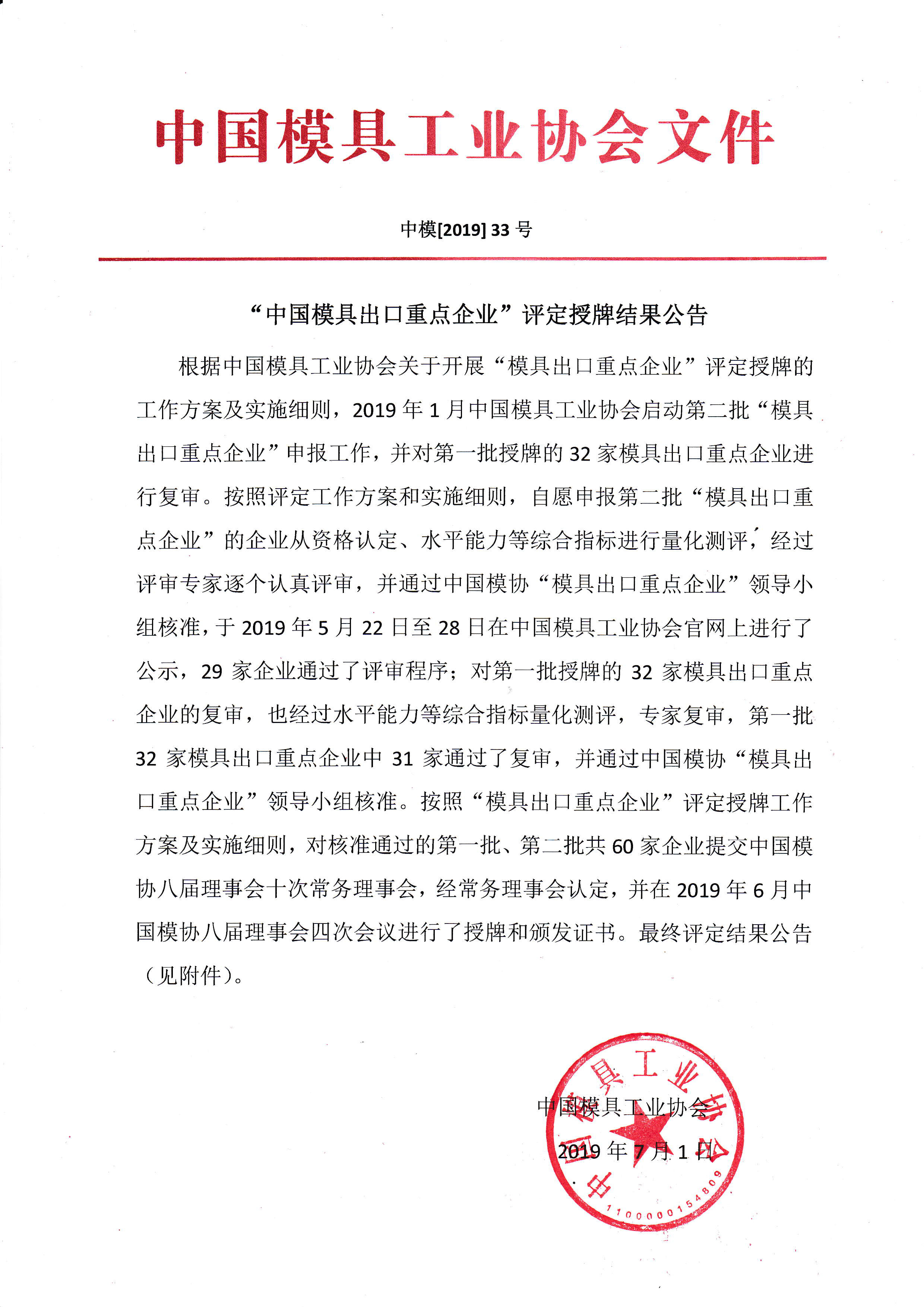 “中國(guó)模具出口重點(diǎn)企業(yè)”評(píng)定授牌結(jié)果公告 |