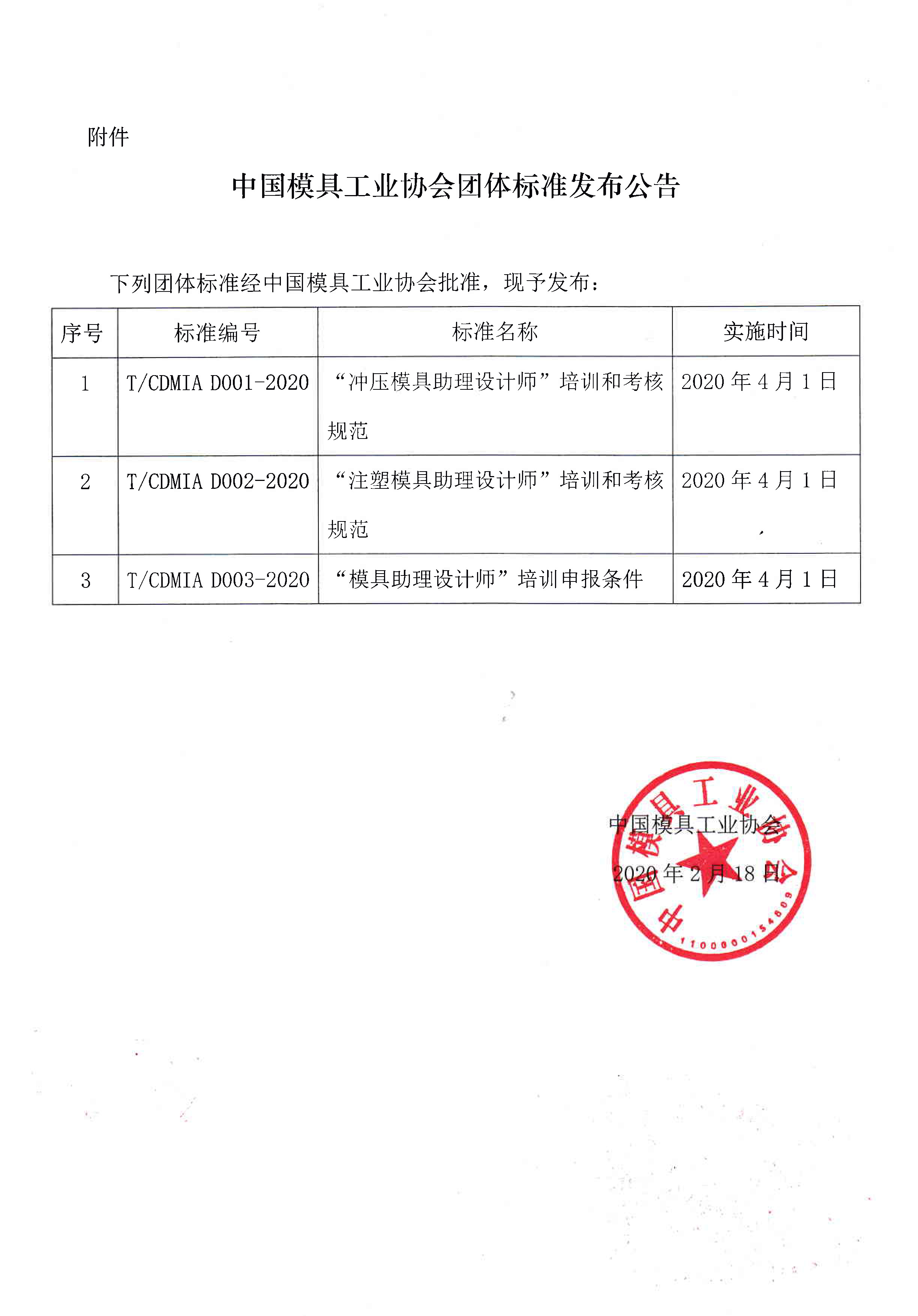 關(guān)于發(fā)布《“沖壓模具助理設(shè)計師”培訓(xùn)和考核規(guī)范》等三項(xiàng)團(tuán)體標(biāo)準(zhǔn)公告的通知