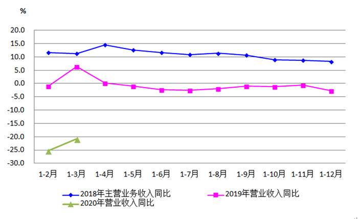 圖2為2020年1-3月份營(yíng)業(yè)收入同比變化與2019年及2018年主營(yíng)業(yè)務(wù)收入同比變化的對(duì)比。由圖可見,2018年4月份達(dá)到14.6%的高點(diǎn)之后波動(dòng)下行,但全年仍保持了8.3%的同比增長(zhǎng),2019年除1-3月、1-4月為累計(jì)同比增長(zhǎng)之外,其余各月均為同比降低。2020年1-3月營(yíng)業(yè)收入同比變化曲線又有大幅下探。