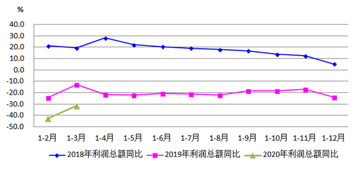 圖4為2020年1-3月份機(jī)床工具行業(yè)利潤(rùn)總額同比變化與2019、2018兩年利潤(rùn)總額同比變化的對(duì)比。由圖可見,2018年1-4月累計(jì)利潤(rùn)總額同比增長(zhǎng)達(dá)到峰值,其后逐月下行,但全年各月利潤(rùn)總額累計(jì)同比始終保持增長(zhǎng)。2019年各月利潤(rùn)總額累計(jì)同比均為降低。2020年1-3月份又有進(jìn)一步下探。