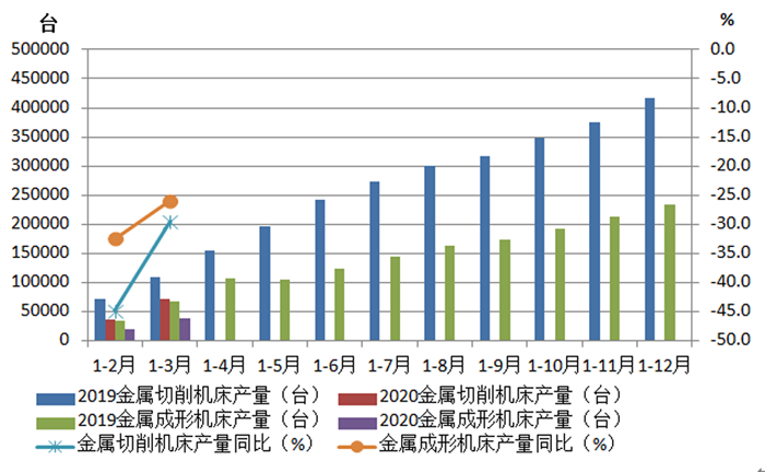 協(xié)會(huì)重點(diǎn)聯(lián)系企業(yè)2020年1-3月累計(jì),金屬切削機(jī)床產(chǎn)量同比下降29.8%;金屬成形機(jī)床產(chǎn)量同比下降37.4%。與國(guó)統(tǒng)局?jǐn)?shù)據(jù)基本吻合。