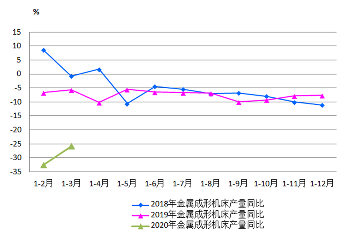 圖6和圖7分別為2020年1-3月份機(jī)床工具行業(yè)金屬切削機(jī)床和金屬成形機(jī)床累計(jì)產(chǎn)量同比變化與2019、2018兩年累計(jì)產(chǎn)量同比變化的對(duì)比。由圖可見,2018年金屬切削機(jī)床產(chǎn)量累計(jì)同比自1-5月達(dá)到峰值后逐月下行,但全年始終為同比增長(zhǎng)。而2019年除1-3月累計(jì)同比增長(zhǎng)外,其他各月累計(jì)同比均為降低,且降低幅度呈逐月加大趨勢(shì)。2018年金屬成形機(jī)床產(chǎn)量累計(jì)同比自1-3月后就已經(jīng)進(jìn)入下行區(qū)間,2019年延續(xù)了上年下行趨勢(shì)。不論金屬切削機(jī)床還是金屬成形機(jī)床,2020年1-3月份產(chǎn)量同比下降幅度均進(jìn)一步加大。