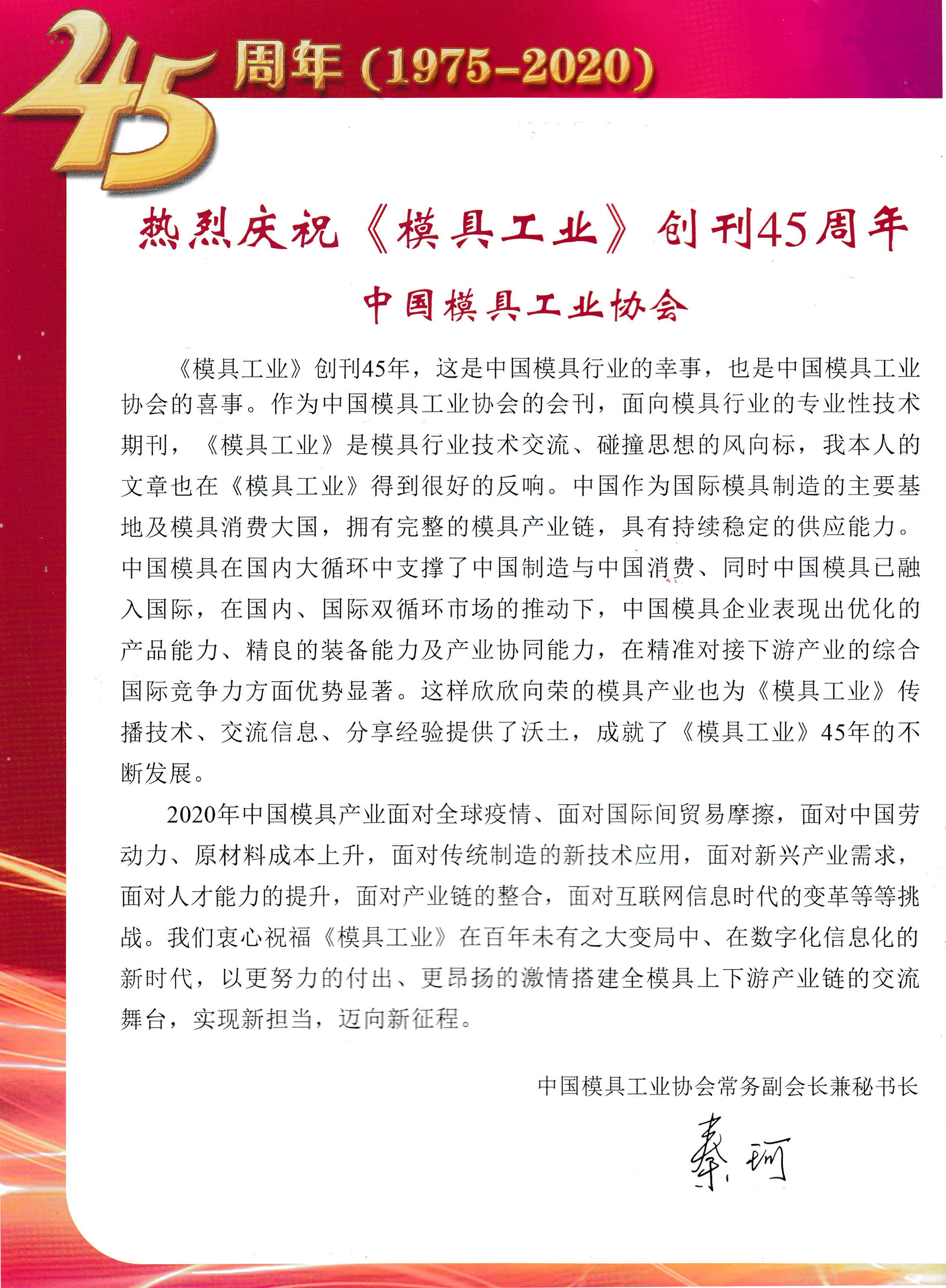 熱烈慶祝《模具工業》創刊45周年——中國模協常務副會長兼秘書長秦珂寄語