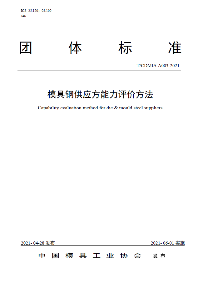 中國(guó)模協(xié)標(biāo)準(zhǔn)A003-模具鋼供應(yīng)方能力評(píng)價(jià)方法-2021