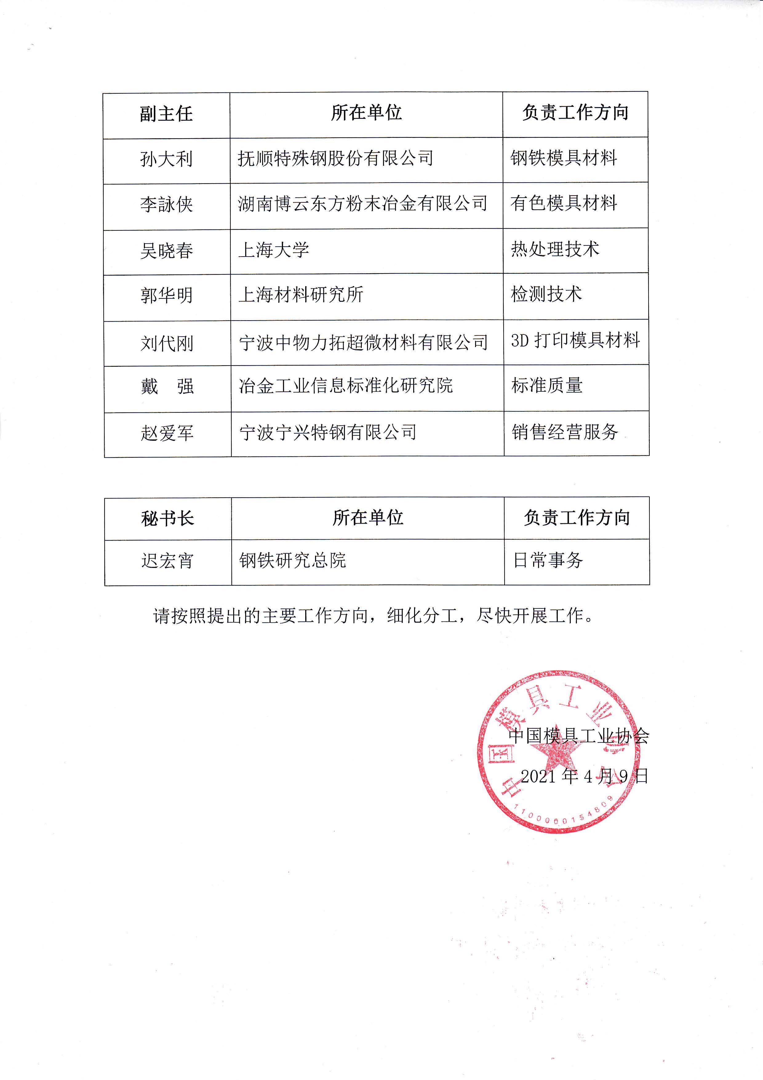 第九屆理事會模具材料委員會建制的批復