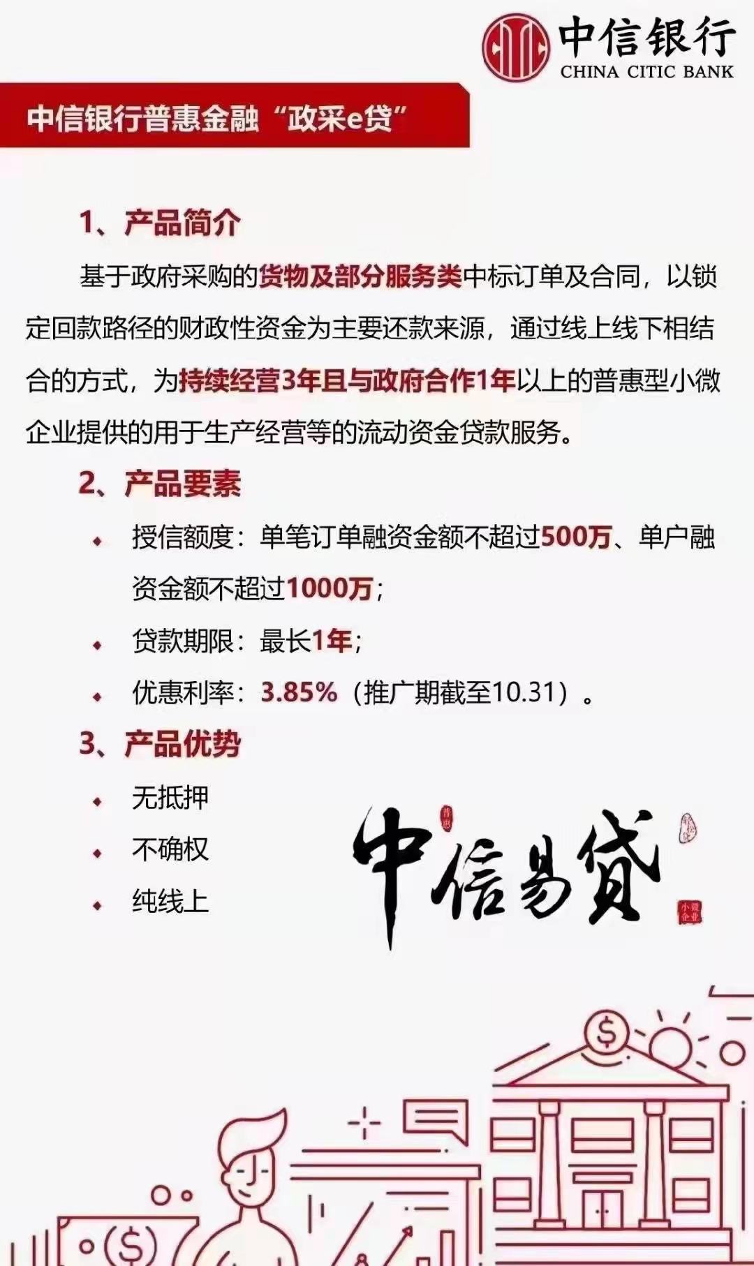中信銀行創新推出“政采e貸”產品,著力幫助解決部分小微企業在中標政府采購訂單后,因信息不對稱等原因導致的“融資難”問題,助力實體經濟復蘇。
