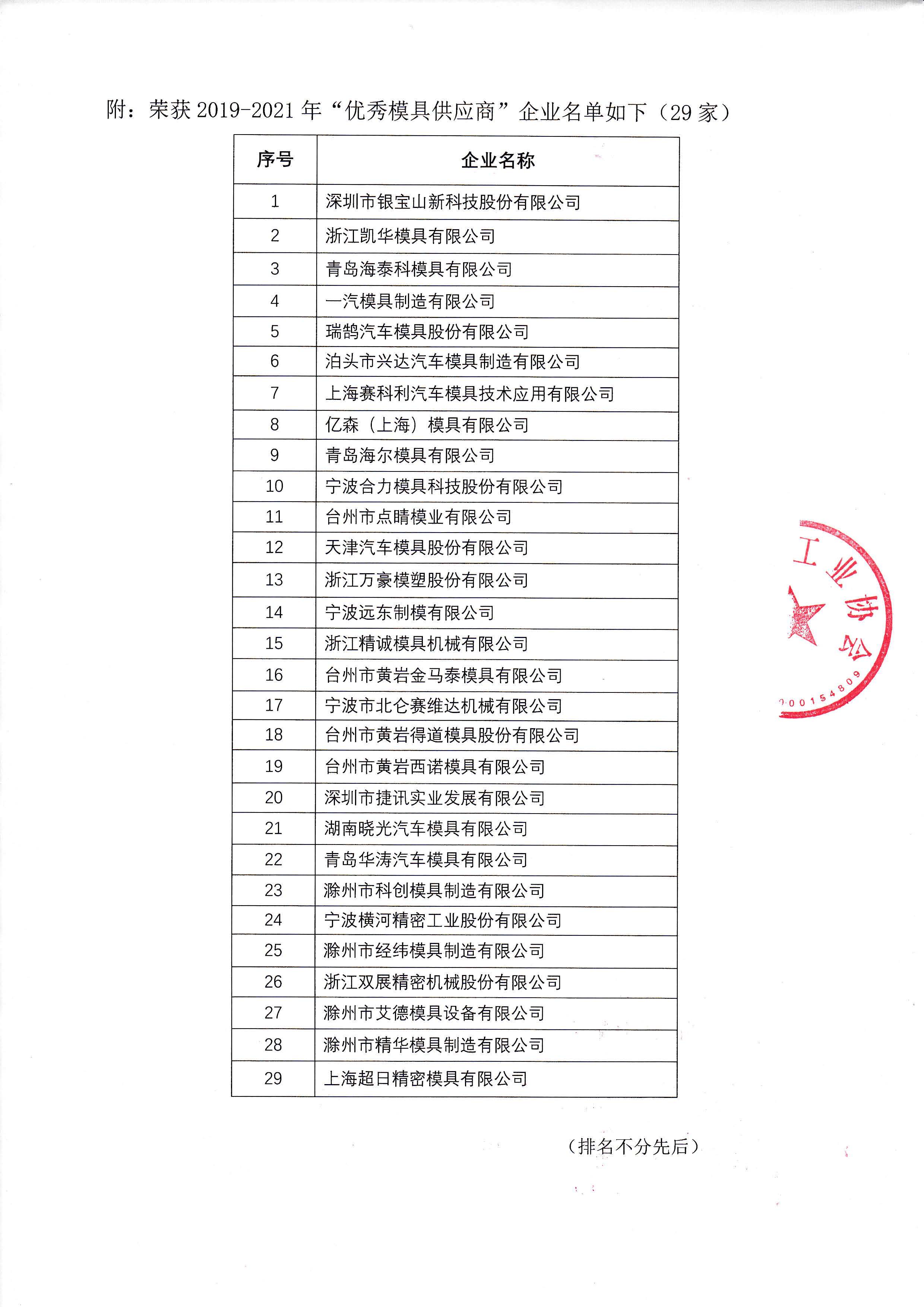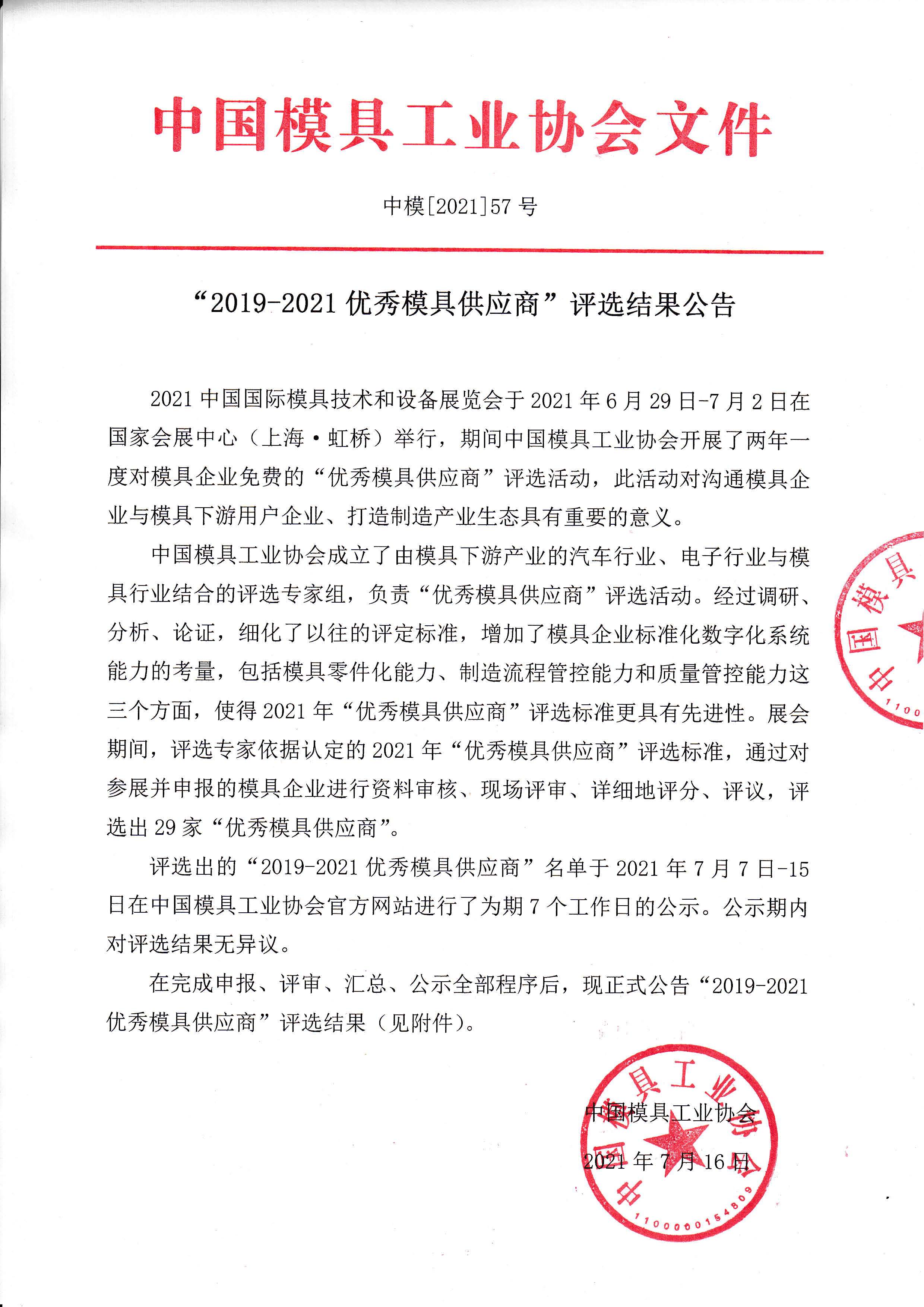 “2019-2021優秀模具供應商”評選結果公告