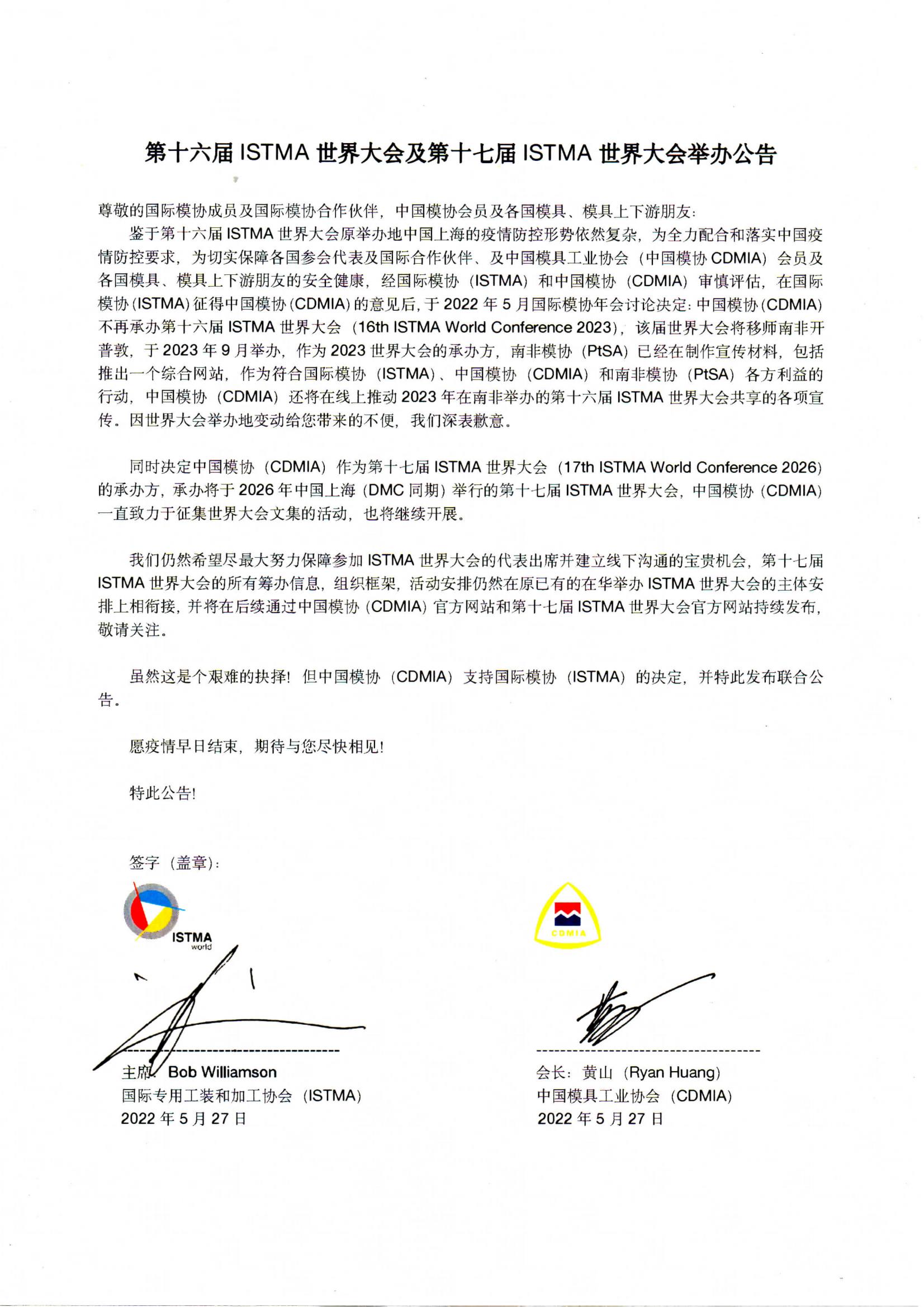 第十六屆ISTMA世界大會及第十七屆ISTMA世界大會舉辦公告