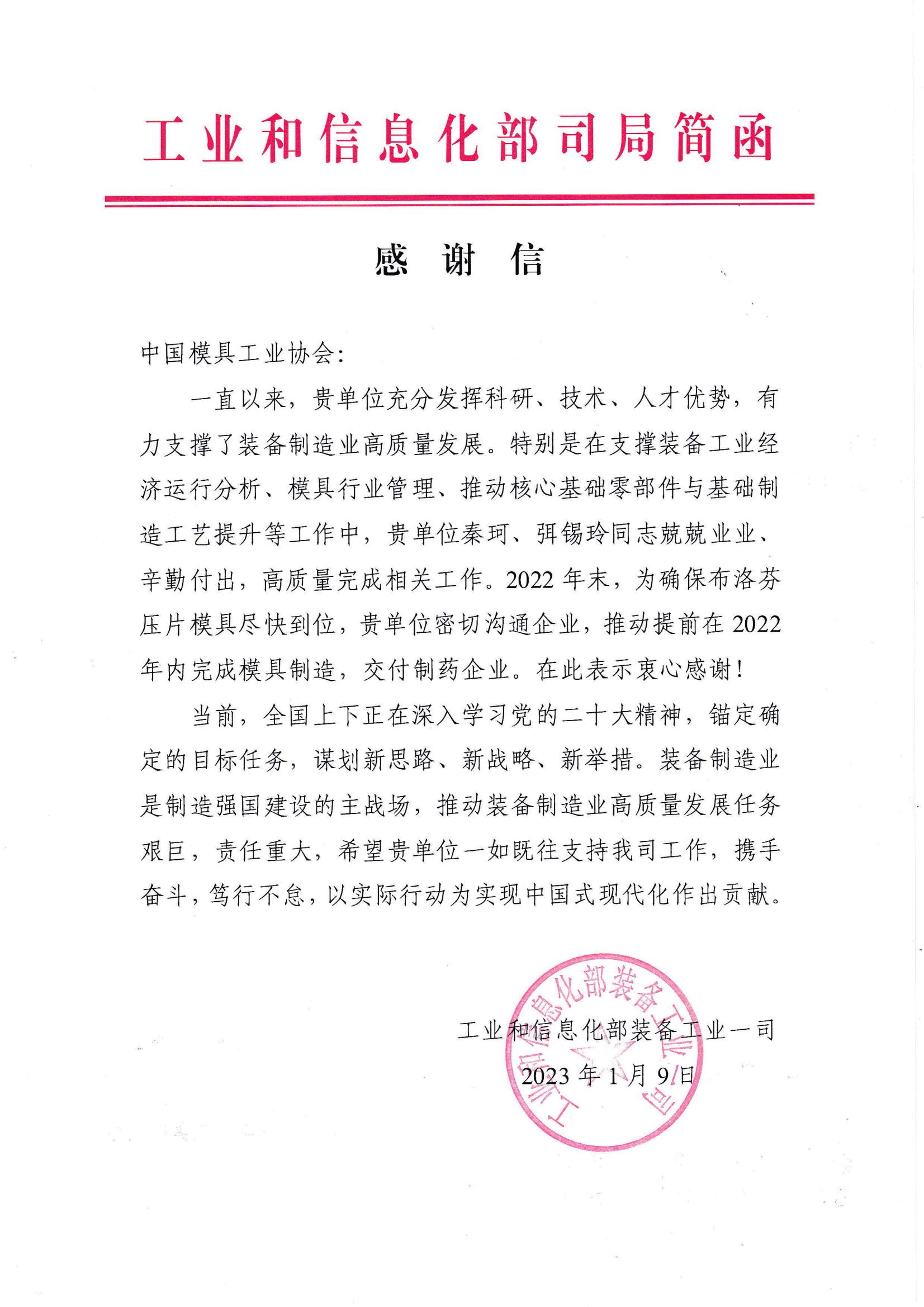 工信部裝備工業(yè)一司致中國(guó)模協(xié)感謝信