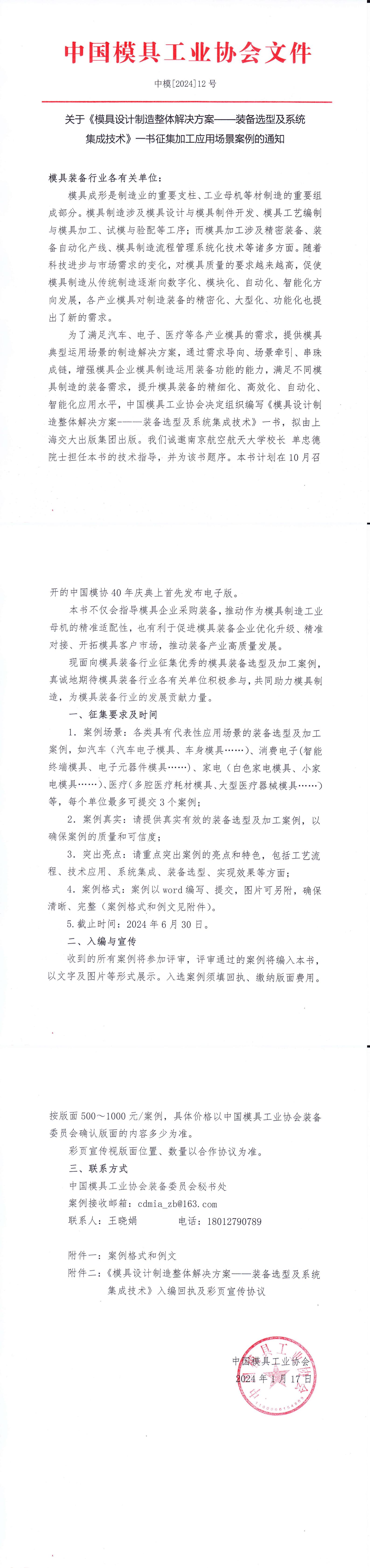 關于《模具設計制造整體解決方案——裝備選型及系統(tǒng)集成技術》一書征集加工應用場景案例的通知