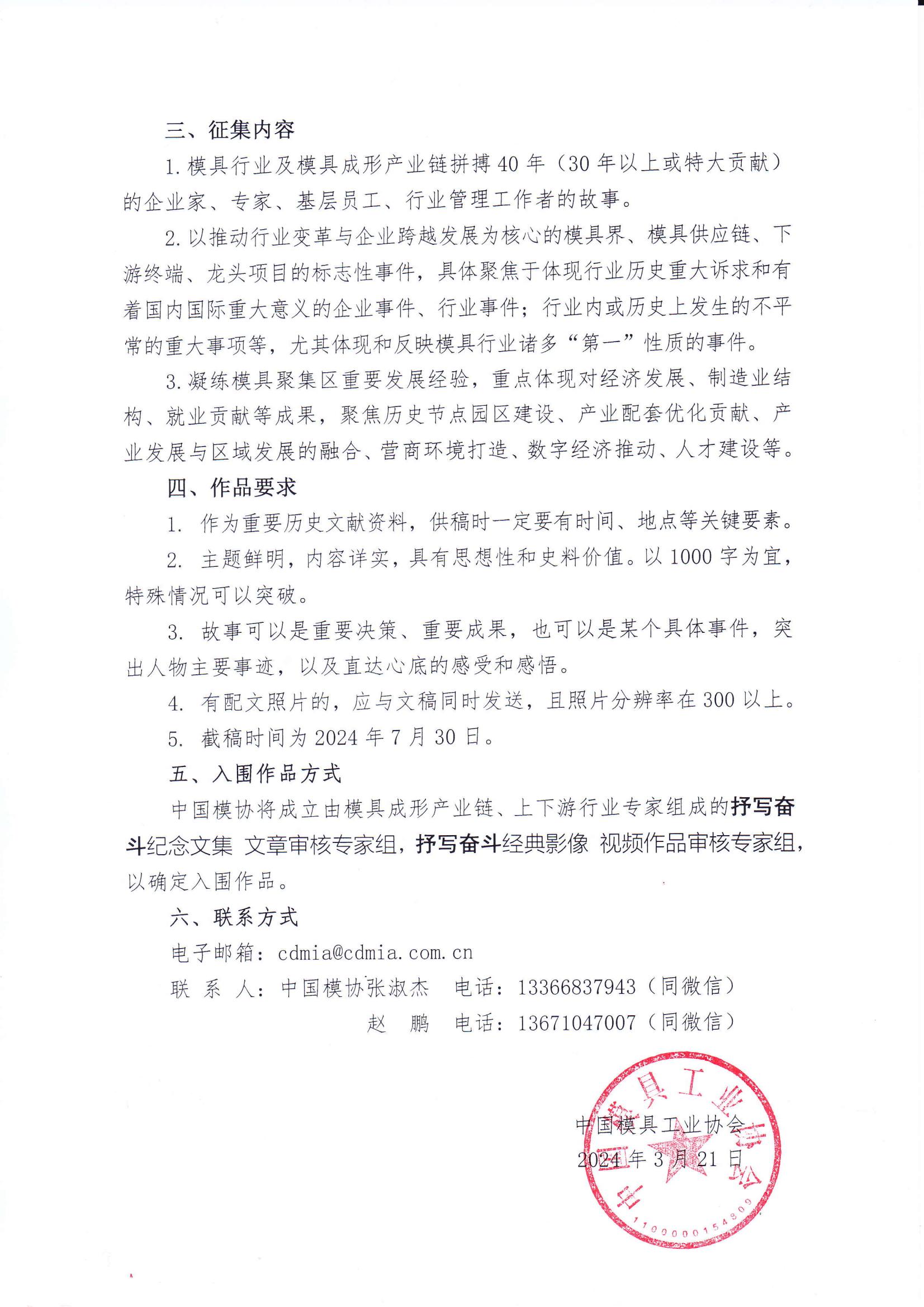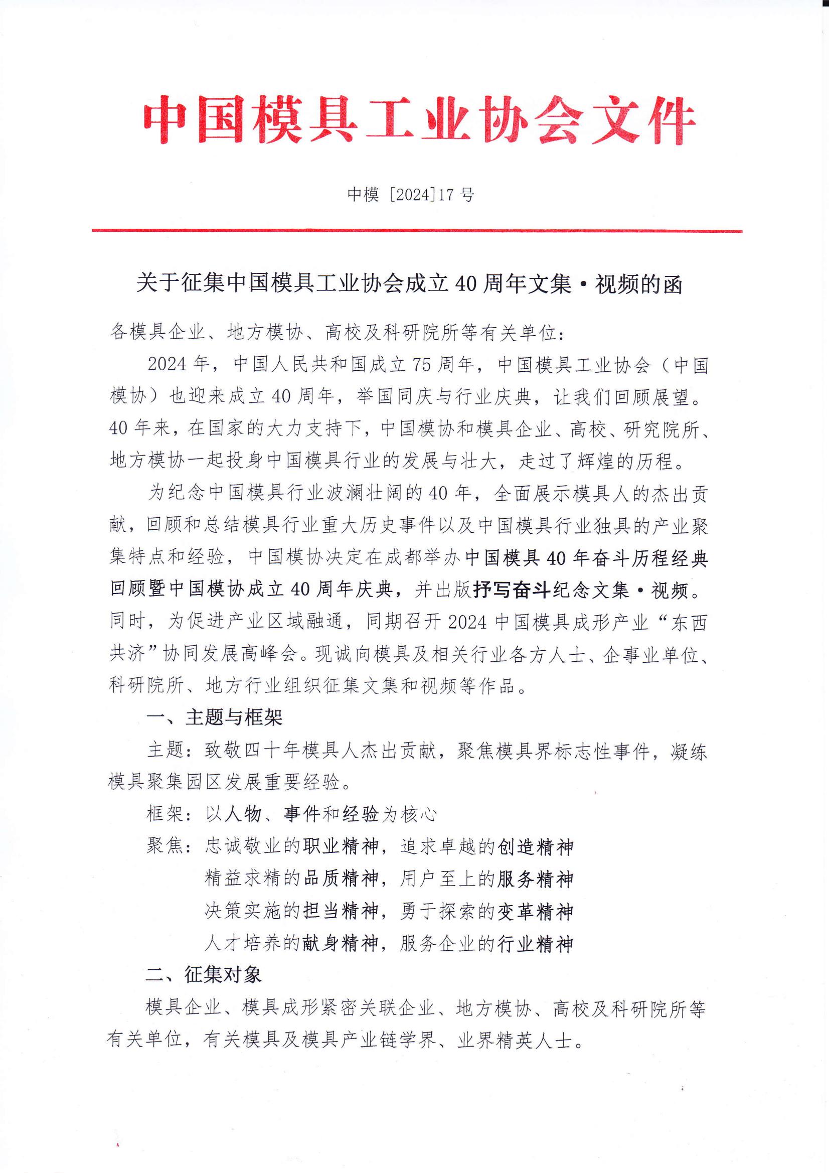 關(guān)于征集中國模具工業(yè)協(xié)會成立40周年文集 視頻的函
