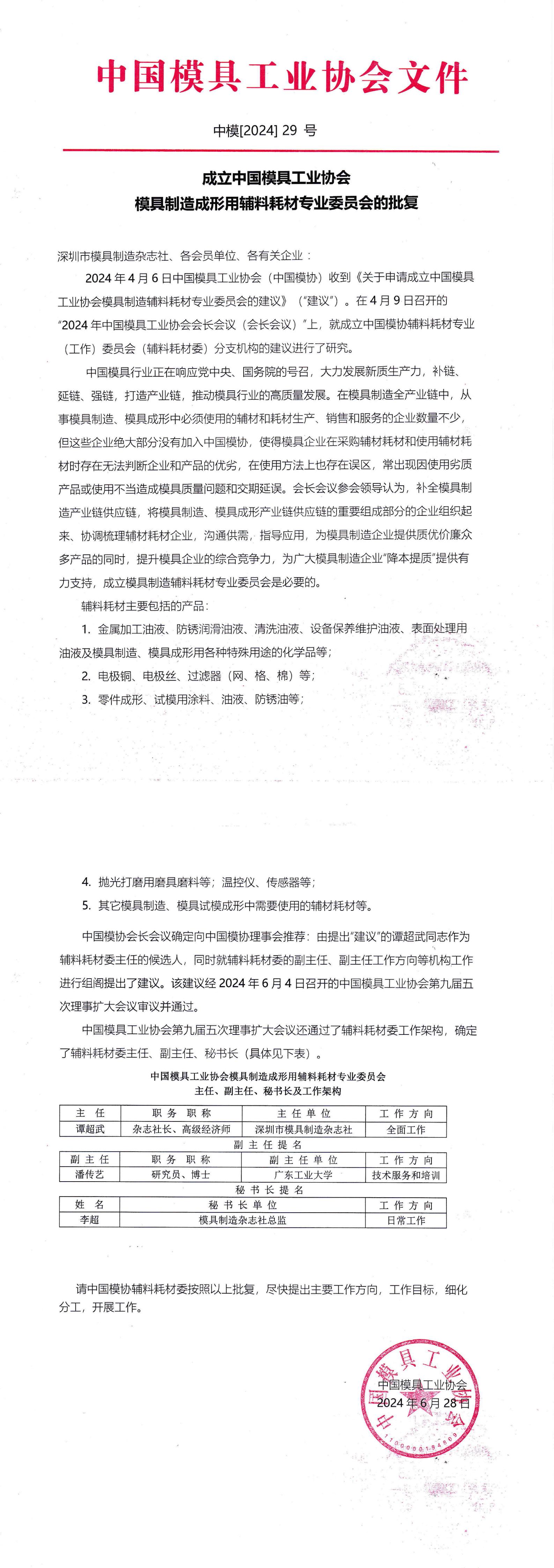 成立中國(guó)模具工業(yè)協(xié)會(huì)模具制造成形用輔料耗材專業(yè)委員會(huì)的批復(fù)